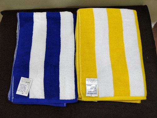 Size : 75X152 CM Fabric : Cotton, Terry Material : 100% COTTON VAT DYED Packing Type: Plastic Bag Weight : 500 GRAM P.PCE Wash Care : YES Color : WHITE X YELLOW / WHITE X BLUE ITEM :- POOL TOWELS SIZE :- 75X175 CMS GSM :- 440 GSM WEIGHT :- 500 GRAM P.PCE PACKING :- 36 PCS P.CARTONS