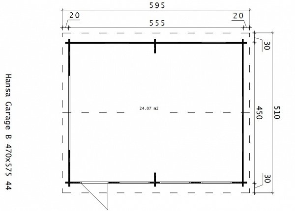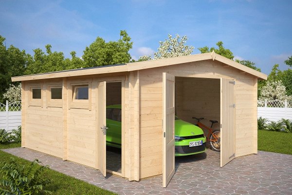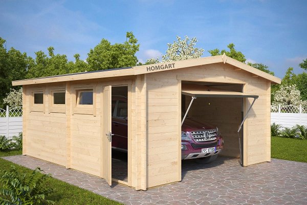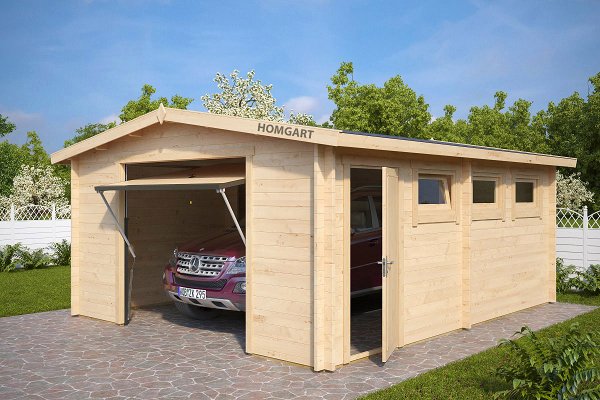 Description: A very wide garage with a door. Additional space on the sides can be used to store garden tools, tools and other things or to create a small workshop. You can order different options for the gate.