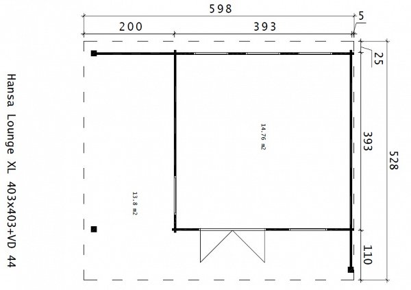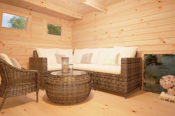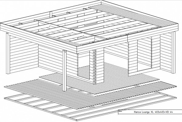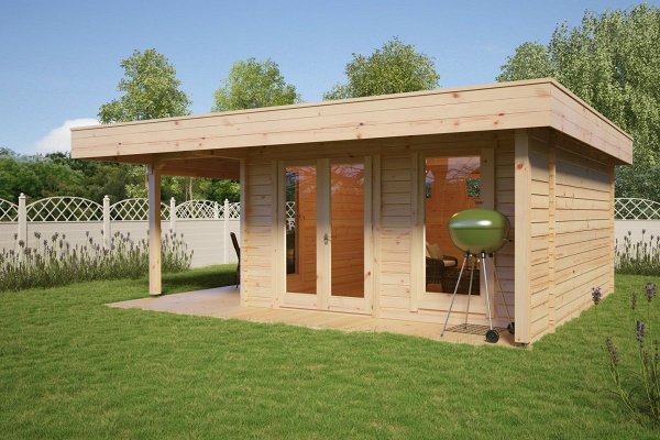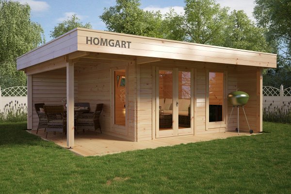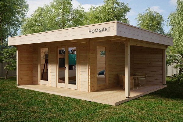 The price includes Harness made of timber 100 x 150 mm, floor logs 100 x 150 mm, floor/terrace board 35 x 135 mm, wall kit with a thickness of 45 mm / 60 mm, doors and windows with fittings, rafters 45/60 mm x 135 mm, roof board 20 x 135 mm, wind board 20 x 100 mm.