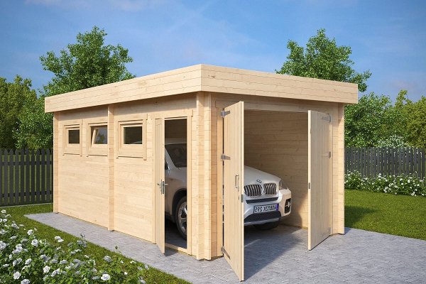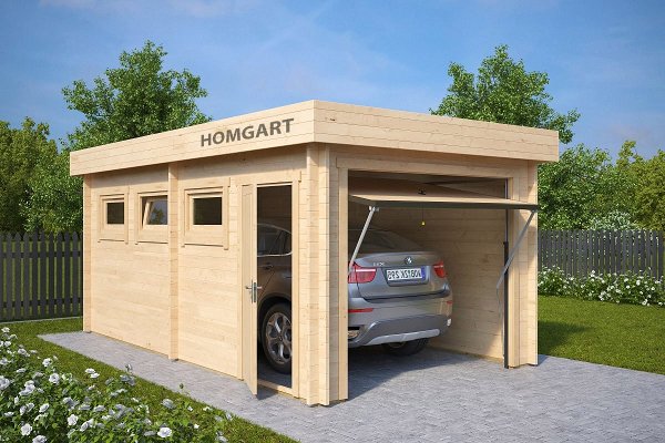 Description: Garage with a door and small windows for natural light. You can order different options for the gate.