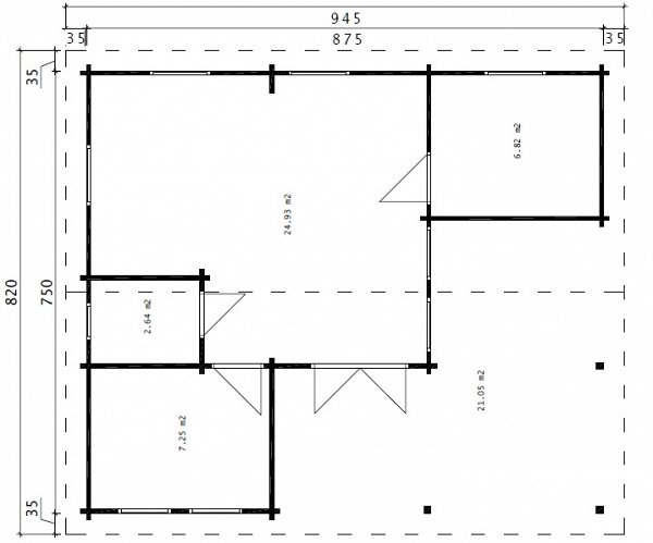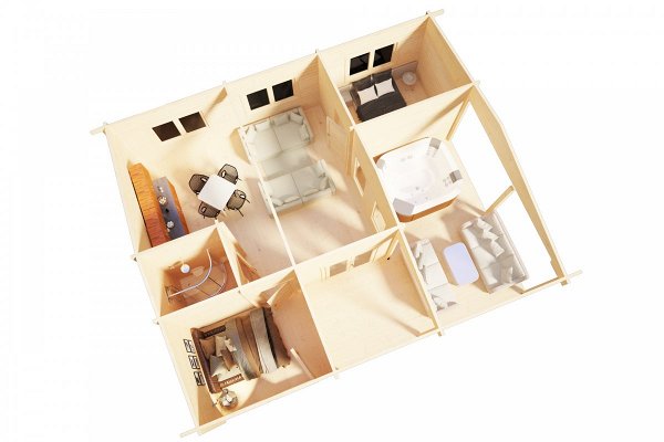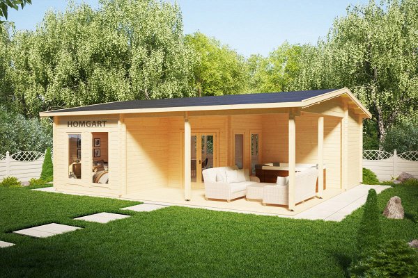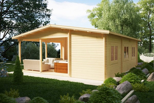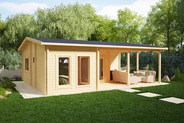 The price includes:Railing made of timber 100 x 150 mm, logs 100 x 150 mm, floor / terrace board 35 x 135 mm, wall kit 45 mm / 60 mm thick, doors and windows with fittings, rafters 45/60 mm x 135 mm, roof board 20 x 135 mm, windboard 20 x 100 mm.