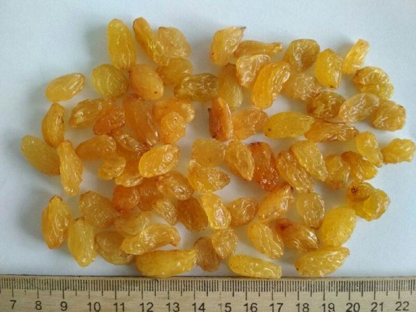 Raisins 325 kcal, Carbohydrates 66g, Moisture 18%, Shelf life 12 months, Organic, packed in polyethylene, Corrugated box of 10-12 kg