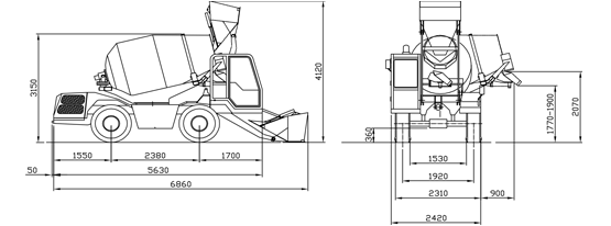 Drum Volume : 5200 liters. Capacity: 4 m3 per batch, (Concrete output @ 75 to 80% of the rated capacity). Double mixing screws, cover for emergency unloading. Drum rotation by hydraulic motor and planetary reducers. Mixing and discharging speed independent from r.p.m. of diesel engine. Discharging by reversing drum. The mixing unit is slewing hydraulic through 270° for high discharge over 2m. on the four sides of the vehicle.